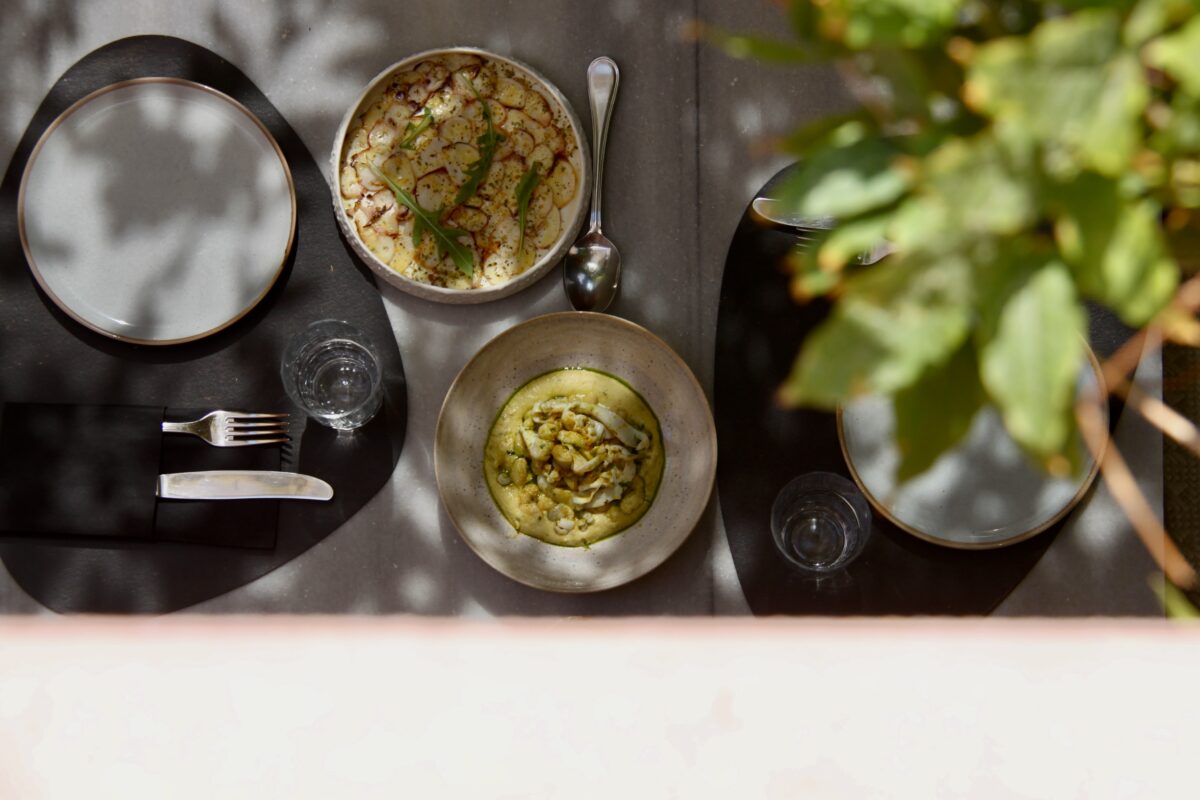 Oia Oenosart is more than a restaurant — it’s a space where art, culture, and community meet. Inside the restored 1800s canava, we host rotating exhibitions, poetry nights, and support both local and emerging artists. We also open early to welcome guests with traditional Greek breakfast and freshly brewed coffee, setting a relaxed tone for the day. This season, we’re expanding our creative offerings with open cinema nights, cyanotype workshops, bundle dyeing sessions, and pottery experiences — inviting guests to engage with art in new, personal ways.