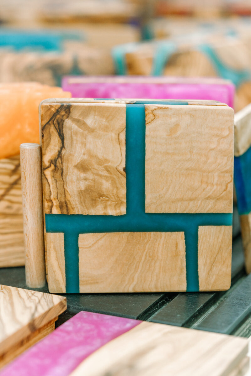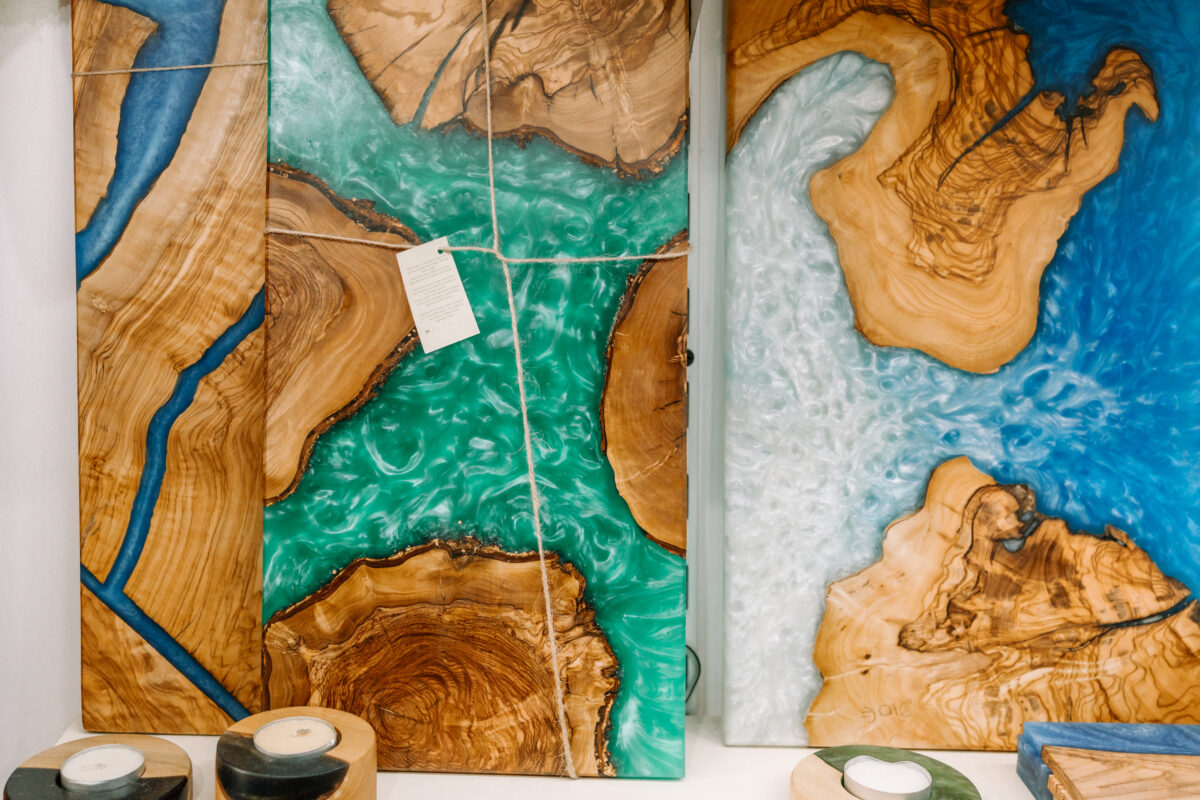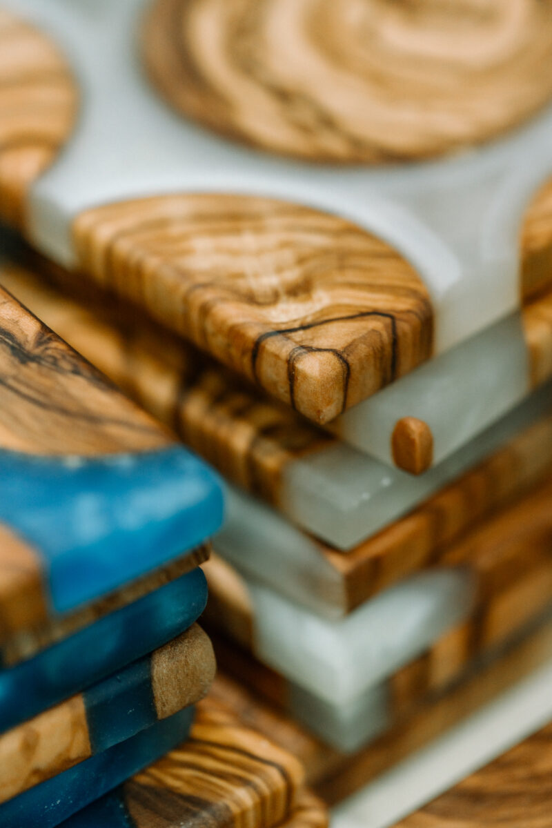 Stunning pieces crafted from olive wood combined with colored resin in various shades.