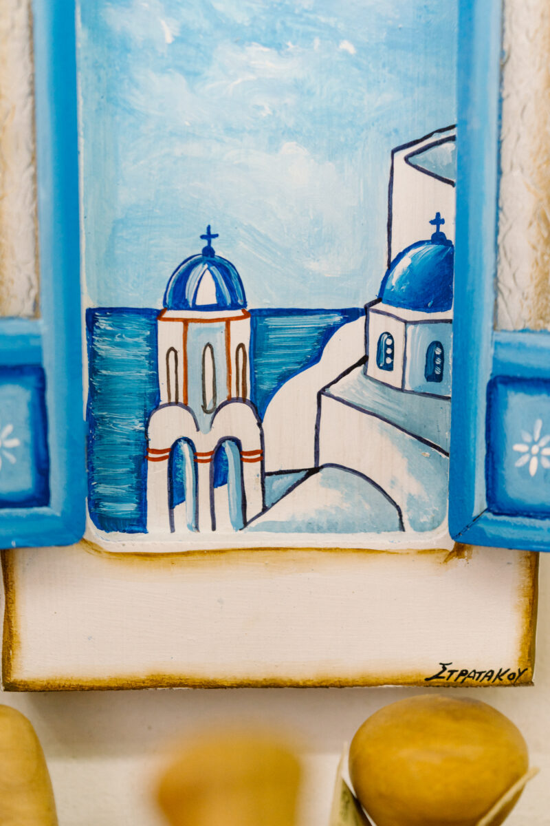 Mrs. Stratakou paints with acrylic paint on pine, beech or poplar the beauty of Santorini. landscapes with the volcano and the sunset, real materials of metal and stones. Each piece is unique.