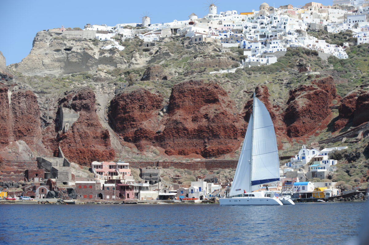 - Swimming at the White Beach and barbeque on board. Sails past Aspronisi, the lighthouse, Akrotiri and the Indian rock.
