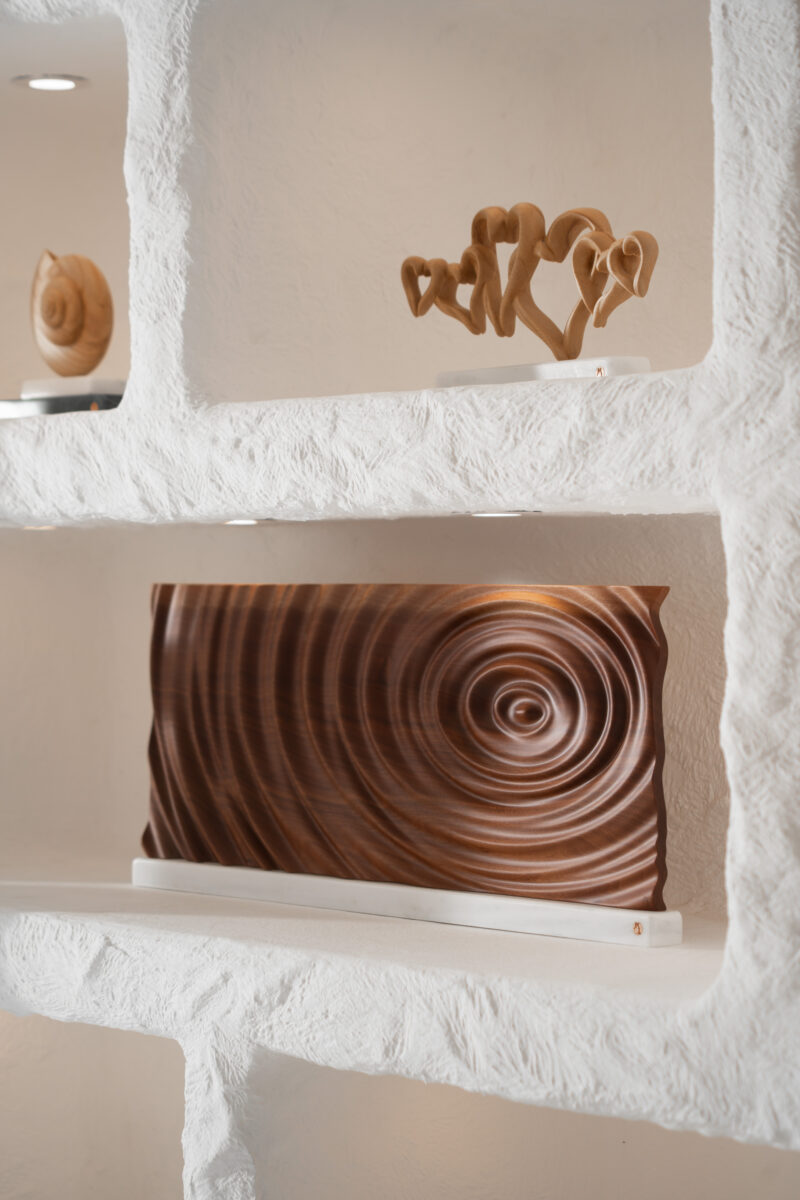 I have been a woodcarver since 2013. I was inspired and studied under Panagiotis and George Thanos, who specialize in carved furniture, and the contribution of Bekos Panagiotis, an excellent church wood carving artist, is also important in my course. Since art also functions as a biological mirror, my place of origin and activity, Santorini, a place with many churches and chapels, simple and unpretentious examples of traditional architecture with ornate wood-carved iconostases, has a great influence on my artistic expression.