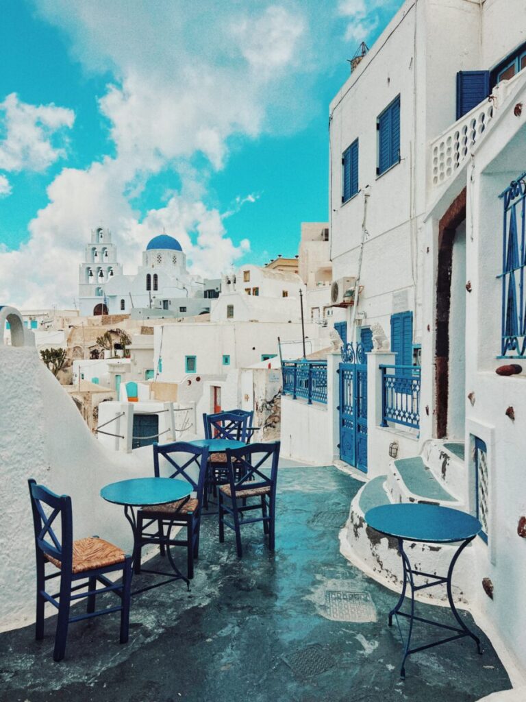Megalochori is one of Santorini’s most picturesque and peaceful villages, perfect for travelers seeking authentic island life without the hustle of the caldera towns. With narrow cobblestone alleys, neoclassical mansions, and whitewashed homes, it feels like stepping into a postcard — but without the crowds.